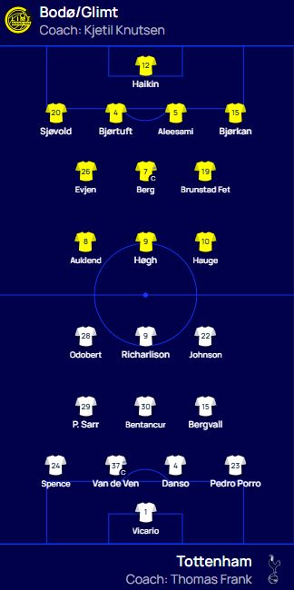 雷速体育10月1日讯 欧冠联赛阶段第二轮,博德闪耀主场迎战热刺。赛前两队首发阵容出炉。